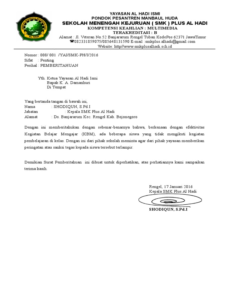 Berikut adalah contoh surat pemberitahuan yang baik dan benar yang dapat anda gunakan sebagi rujukan. Download Full PDF Package. Contoh Surat Penugasan Wali Kelas Surat Pedia. Contoh Surat Pemberitahuan Praktek Kerja Industri Untuk Sekolah SMK. Contoh SK Pengangkatan RT Imam Desa Dan Tokoh Adat Format 425 x 703 Contoh Sk Pengangkatan Pendidik Dan Tenaga Kependidikan Revisi Format 638 x 976 pixel Download Contoh SK Pengangkatan Operator Sekolah Terbaru Format Format 450 x 640 pixel Download Contoh SK. Sebagai bahan pertimbangan bersama ini saya lampirkan.