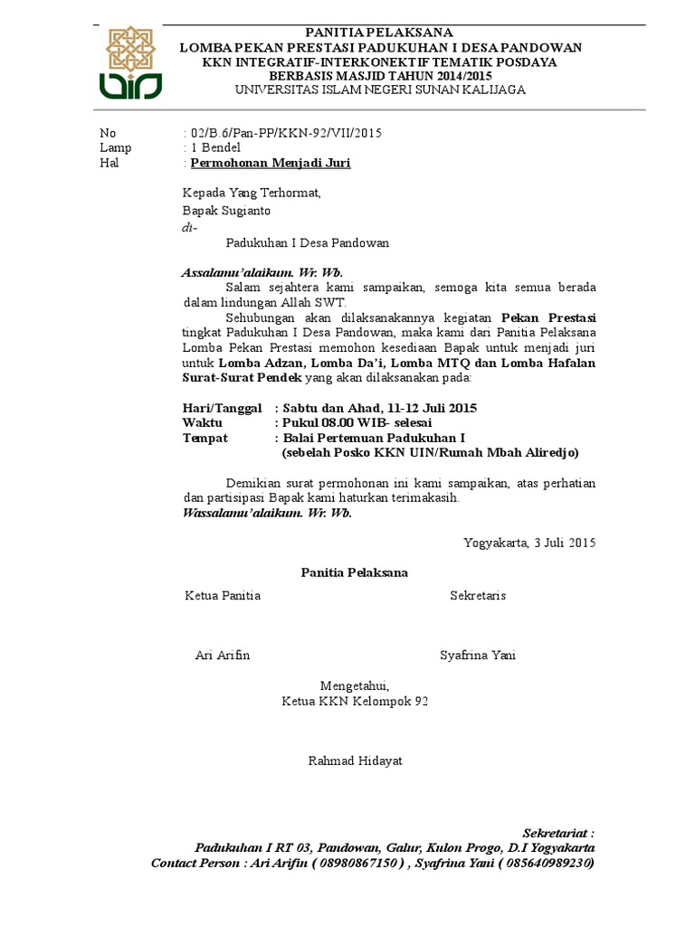 Simak 5+ contoh surat undangan juri. Contoh Surat Permohonan Izin Juri. Bila anda akan memakai Contoh Surat Permohonan Menjadi Juri Perlombaan silahkan di rubah beberapa bagian sesui dengan keperluan mungkin di awal atau di akhir kalimat. Contoh surat kesediaan menjadi juri. Baca juga contoh:juri dan contoh surat undangan juri Contoh Surat Undangan Juri Lomba Sample Surat Undangan.